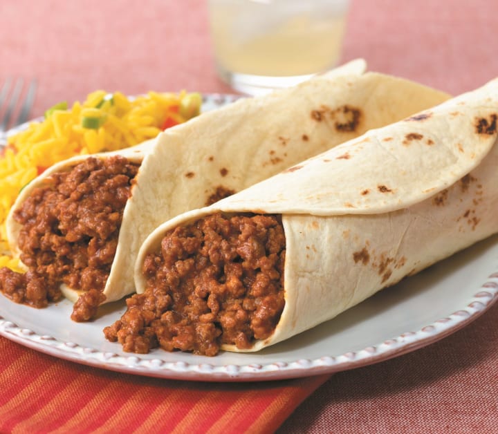 Burritos consist of wheat flour tortillas filled with meat, beans, rice, lettuce, guacamole, and cheese.