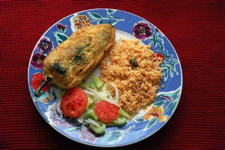 Chile relleno is a dish that originated in the city of Puebla. It is prepared with chili peppers stuffed with ingredients like cheese, nuts, cinnamon, and diced meat. After the peppers are stuffed they are dipped in eggs and flour, then deep-fried in hot oil. It is served as an appetizer or snack.