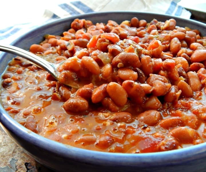 Frijoles charros is a dish that is made with beans, onions, tomatoes, chile peppers, and coriander. The meat used for the dish is bacon, ham, or salt pork. The ingredients are cooked with liquid in a pot until the beans are tender and some liquid still remains.