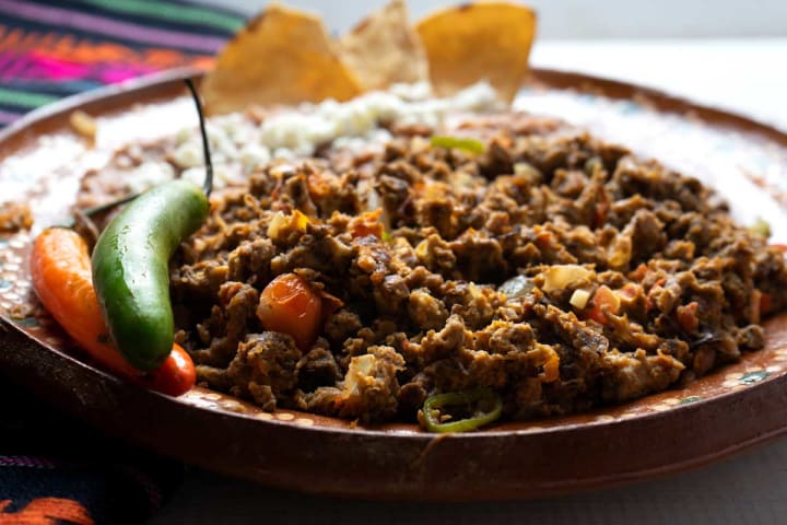 Machaca is a traditional dish that is prepared with marinated and shredded beef. The marinade includes garlic, salt, pepper, lime juice, Worchestershire sauce, and chilis. The beef is then cooked with onions, garlic, bell peppers, and finely chopped tomatoes.
