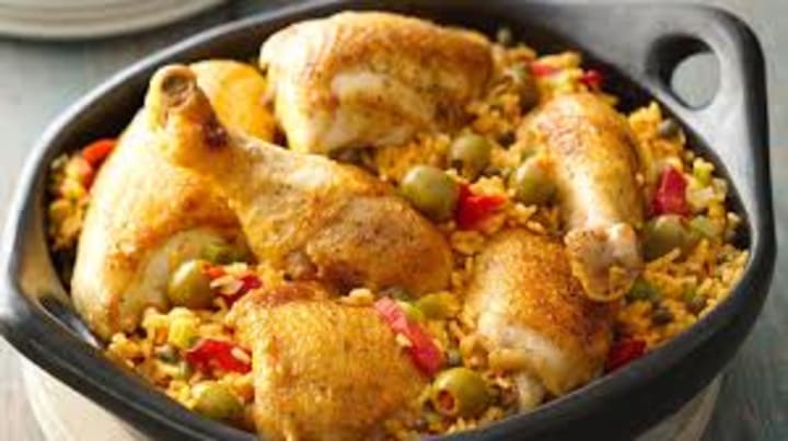 Arroz con Pollo – which means rice with chicken in Spanish. The usual ingredients consist of rice, beer, stock, sofrito, chicken and saffron. The ingredients are sautéed together and simmered until the liquid evaporates.