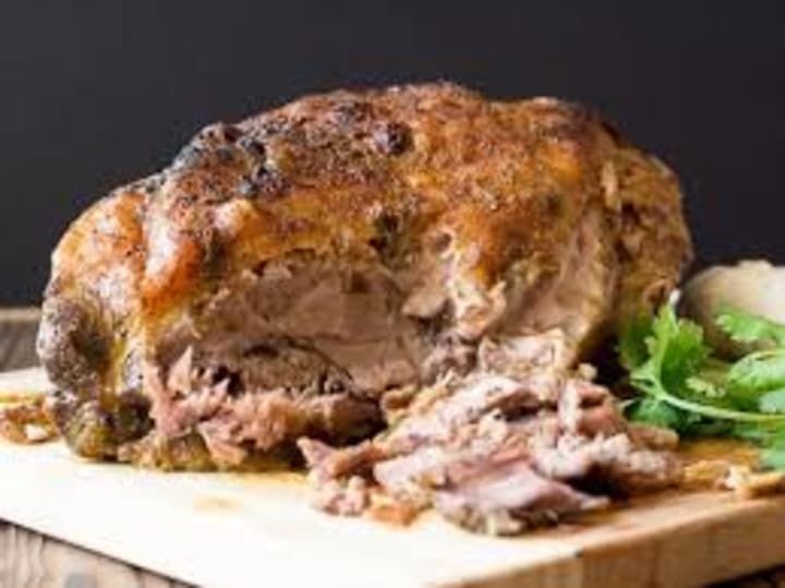 Pernil is a dish made of slow-roasted pork shoulder. The pork is seasoned with garlic, oregano, and pepper. The pork roasts most of the day and the result is a crunchy skin and very tender meat.