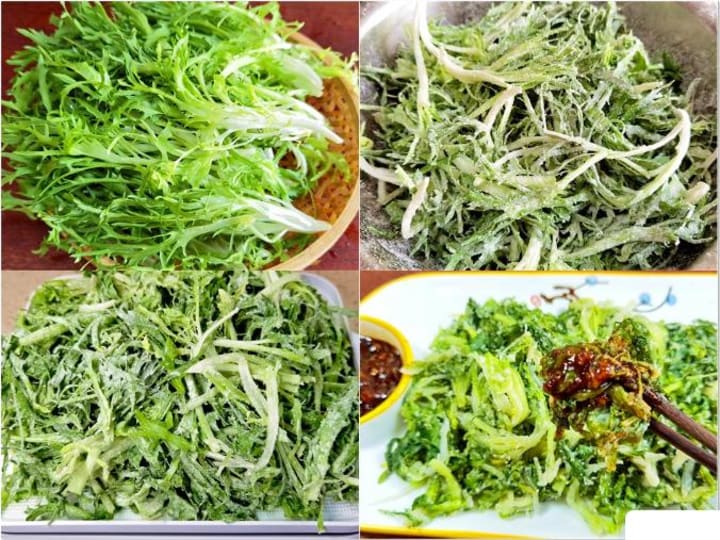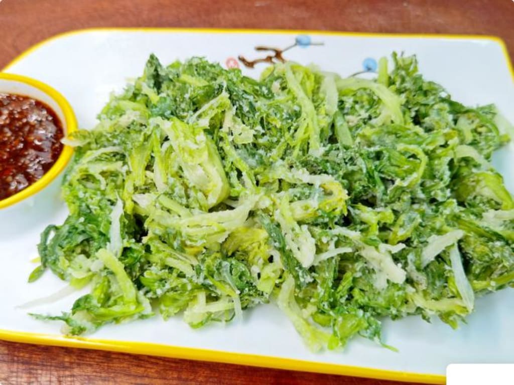 Wash fresh chrysanthemum greens and drain well. Lightly coat them with a thin layer of flour (or cornmeal). Steam over boiling water for 3–5 minutes until the leaves turn bright and tender. Gently fluff them up, then drizzle with a savory sauce (minced garlic, light soy sauce, vinegar, and a few drops of sesame oil). The taste is mildly bitter with a sweet aftertaste, and the texture is soft yet slightly chewy.