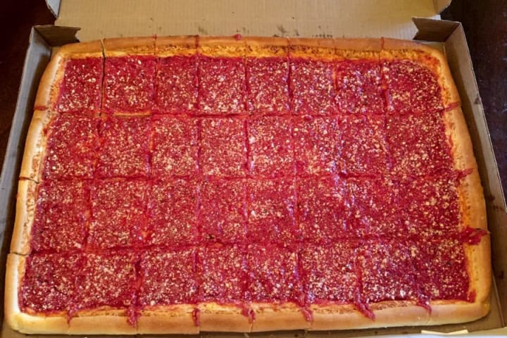 Tomato Pie—this is a cheese-less pizza two feet by three feet in size, with extra oregano. It is usually served cold or at room temperature. It is mostly found in the Northeast section of Philadelphia. The basic recipe the dough is made so that it is like a baked flat Italian bread on which tomato sauce is spread then sprinkled with grated Romano cheese. It is made similarly to Sicilian pizza in a large aluminum pan and served in square slices.