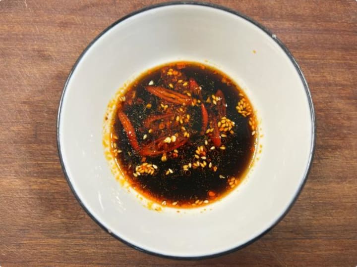 • Add soy sauce, vinegar, sugar, salt, peppercorn oil, chili oil, and lemon juice. Whisk vigorously.