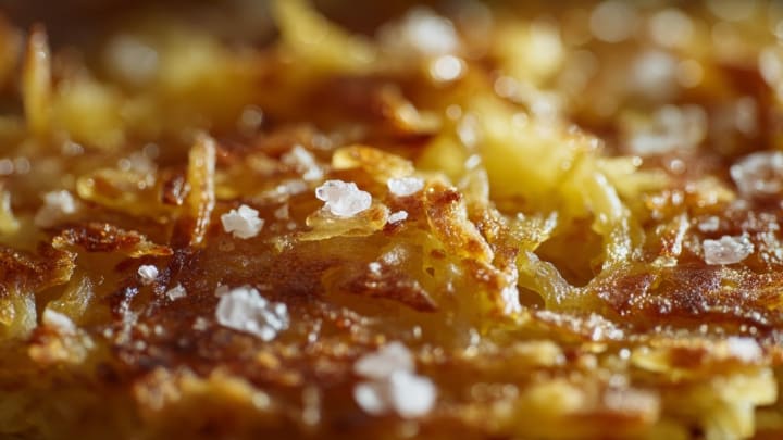 The technique is deceptively simple: parboiled potatoes, grated coarsely, pressed into a cake, and cooked until each edge turns amber and crisp. Inside, the potato remains soft and buttery, infused with flavor from the melted fat. The result is a harmony of contrast — golden crunch giving way to cloud-like tenderness.