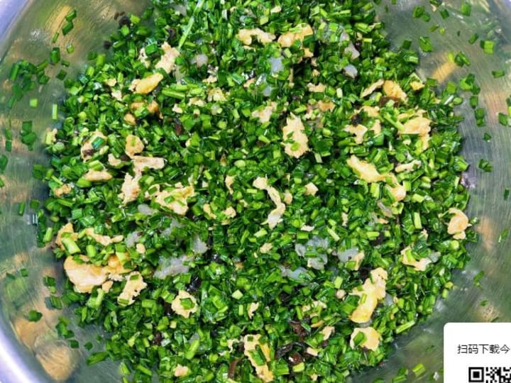 3. Prepare the chives: Wash and thoroughly dry the chives—any excess moisture will make the filling soggy. Finely chop them and place them in a large bowl. Critical step: Before adding salt, toss the chives with 2 tbsp of sesame oil or neutral oil, coating every strand to lock in moisture.