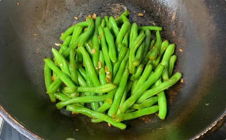 • Return beans to the wok. Toss vigorously to coat in fat.