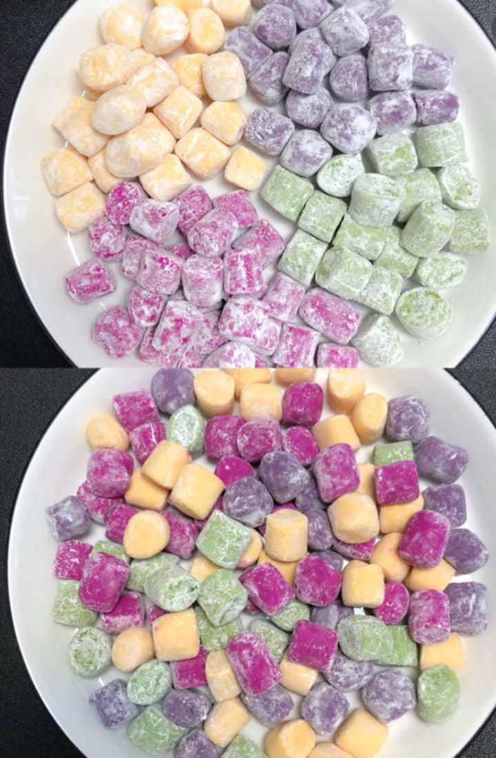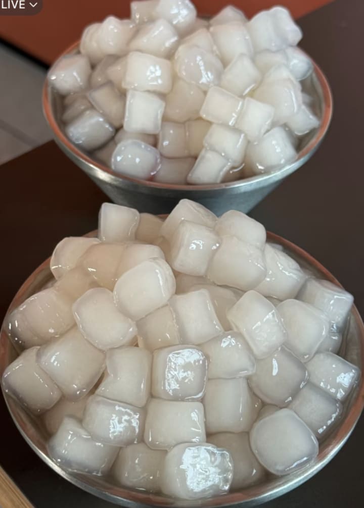 If you find those two jellies' smooth and soft taste and texture dull and uninteresting, we have tapioca pearls to balance this bland mouthfeel. These milky white, tiny, QQ (chewy) bite-sized pieces(often like little cubes or pearl balls ), called A-Da-Zi(阿达子)in Chinese, are made from tapioca starch. We prepare 200g of tapioca starch, 20g of white sugar mixed in a bowl and 160g of boiled water aside. Gradually pour some hot water each time while simultaneously stirring the mixture quickly until it forms into a smooth, lump-free texture dough. After that, we roll the dough into a log and chop it into bite-sized pieces. If you don't want to look like a rookie at cooking, dust the pieces with extra tapioca starch to prevent sticking. Then, we throw them into the boiling water until they are soft. Compared with the smooth jelly ingredients, they are tender and chewy yet toothsome and require more patience to chew.