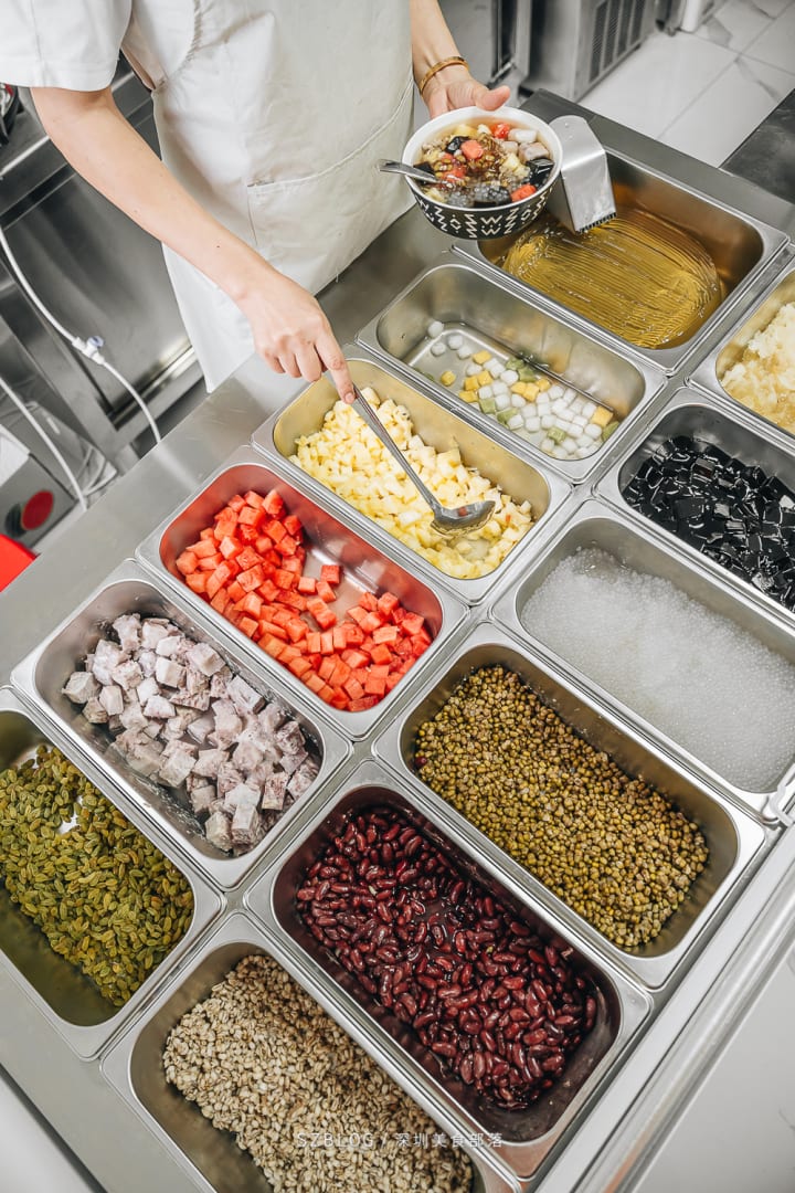 Let's move on to the hard pick —a complementary component choice for this dessert. We have mung beans, red beans, Job's tears, lotus seeds, white fungus, and raisins for you to choose from. They all have health benefits, whatever one you pick. Mung beans are cooling in nature, and red beans are rich in fibre; they bring clear heat and detoxification. Job's tears and lotus seeds eliminate inner dampness from your body. White fungus is good for the lungs, and raisins support your heart. Apart from raisins, they are all slow-cooked until soft and chewy yet toothsome while keeping a subtle bite.
