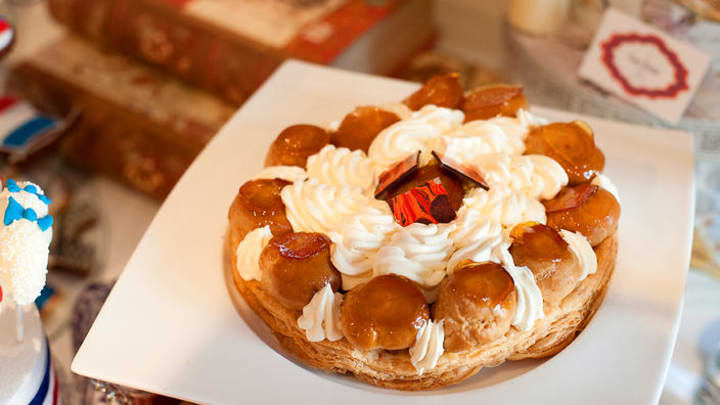 St. Honore Cake was named after Saint Honore, the French patron saint of bakers. This cake is a delectable combination of puff pastry, vanilla custard, choux pastry, and caramelized sugar. Puff pastry is used as a base and given generous piping of custard, then topped with cream puffs that have been dipped in caramelized sugar.