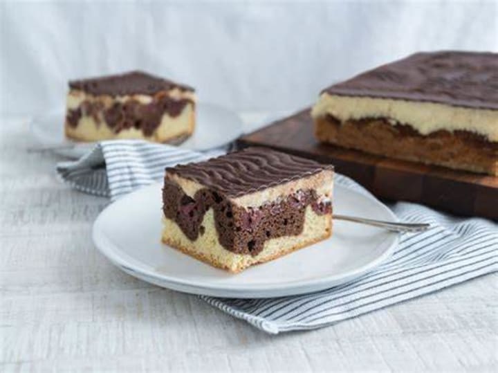 Donauwells is a German and Austrian sheet cake. The cake consists of two-pound cakes, one on the bottom, flavored with vanilla, and one on top, flavored with chocolate. The top of the cake has cherries, buttercream, and chocolate ganache. As the cake bakes, the tart cherries fall into the batter creating a wavy pattern.