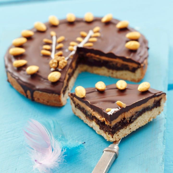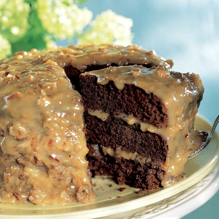 German chocolate cake is an American creation. This cake consists of three interspersed layers of buttermilk sponge and chocolate with desiccated coconut and peanuts. The cake is garnished with more coconut, pecans, or maraschino cherries.