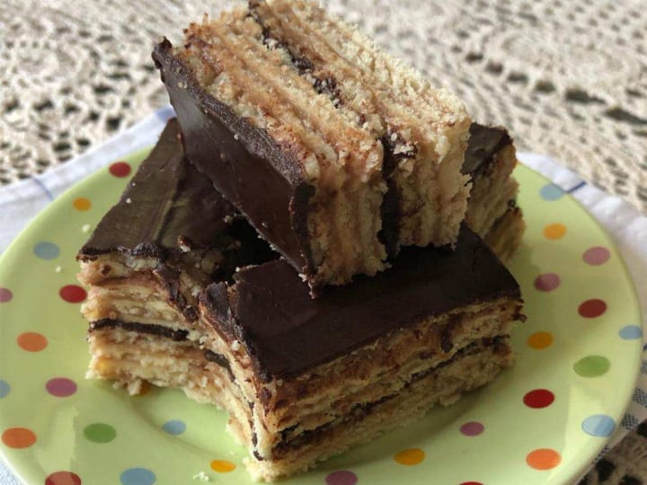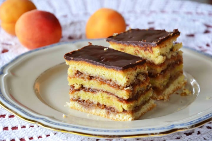 Zserbo is a layered chocolate-topped apricot and walnut cake. The original recipe requires apricot preserves. The round cake consists of six thin sponge cake layers and five layers of chocolate buttercream. So that the cake does not dry out, it is topped with a layer of hard caramel, and the sides are coated with ground nuts.