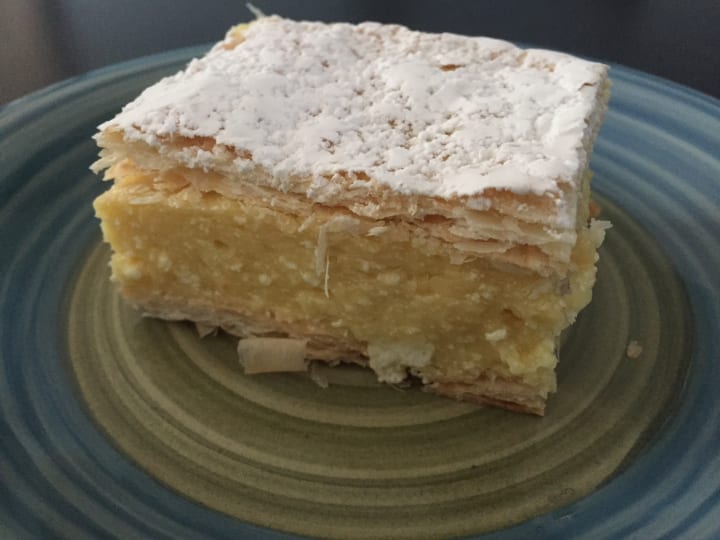Kremes means creamy. This is a cake prepared with two layers of puff pastry with lots of pastry cream in between. The pastry cream should be light and airy, and once done, the top is dusted with powdered sugar. Traditionally the cake is cut into large, rectangular slices.