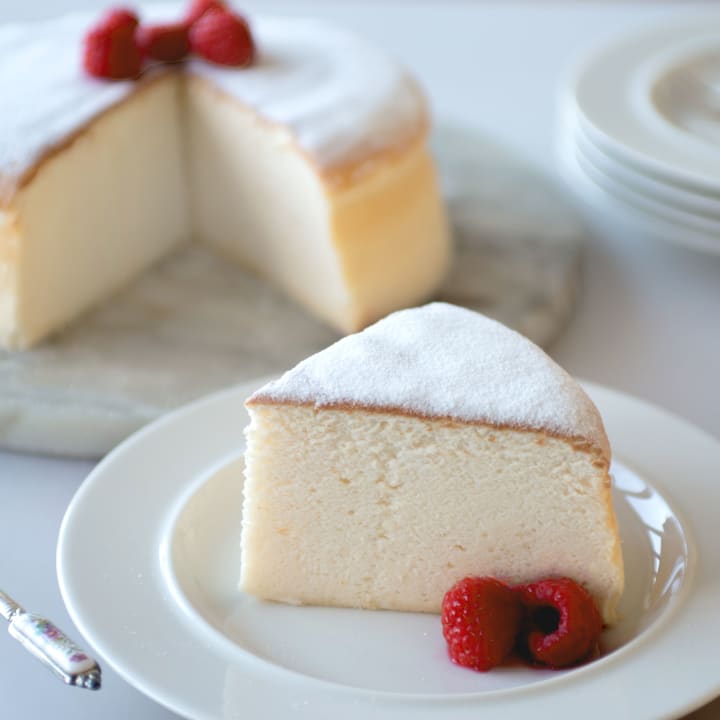 Souffle cheesecake or cotton cheesecake, or Japanese cheesecake is a light and fluffy dessert. It is prepared with whisked egg whites incorporated in eggs, milk, sugar, and cream cheese. Then the cake is baked and comes out fluffy and more sponge-like than a cheesecake.