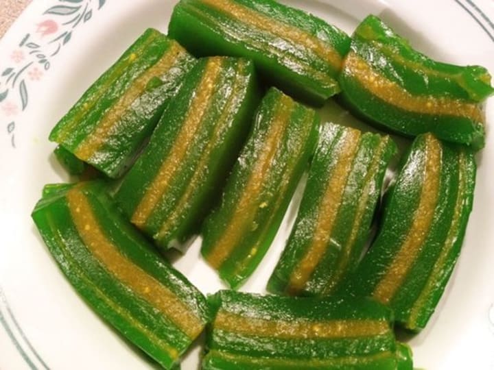 Steamed Tapioca Layer Cake is a traditional Vietnamese dessert. The cake consists of chewy layers prepared with pureed mung beans, tapioca starch, rice flour, and coconut milk or water. Traditionally the cake has a pale yellow mung bean layer and a green layer flavored and colored with pandan leaves. After steaming the cake, it is chilled and cut into diamond shapes.