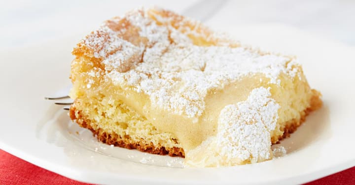 Gooey Butter Cake originated in St. Louis, Missouri. This is a flat cake prepared with wheat flour, butter, sugar, and eggs. Traditionally it is garnished with powdered sugar and a few raspberries, The cake is sweet, dense, and firm similar to the texture of a brownie.