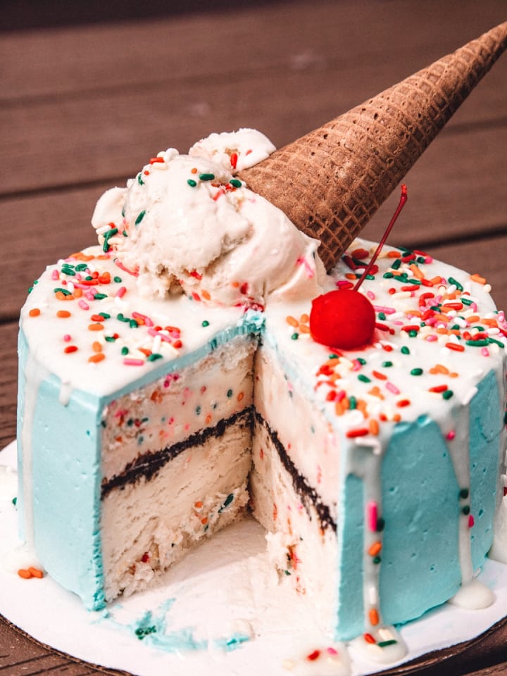 Ice Cream Cake consists of layers of ice cream and cake pastry. The cake is covered with soft-serve ice cream that acts as icing but can be covered with traditional icing. It is often served on birthdays and special occasions.