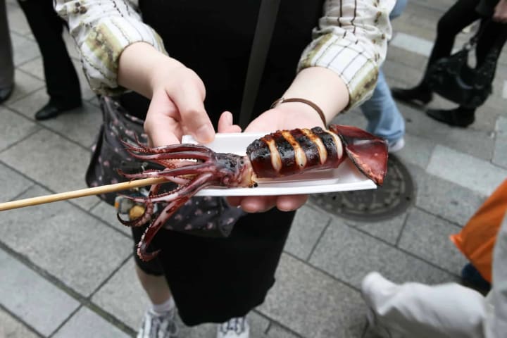 Ikayaki is a very popular street food, especially in Osaka. It's completely normal in Japan to have grilled squids on a stick sold by vendors. The squids are typically topped with soy sauce and turn out to be a charred, chewy delight.