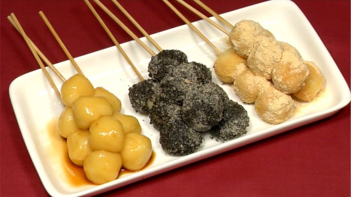 This type of wagashi (aka, Japanese sweets), Dango, are a very popular street food that give a burst of flavor and different textures. Dango is a form of glutinous rice flour made into round dumplings that are often coated in red bean paste or sweet syrups. This sticky, chewy treat is definitely a must if you're in Japan!