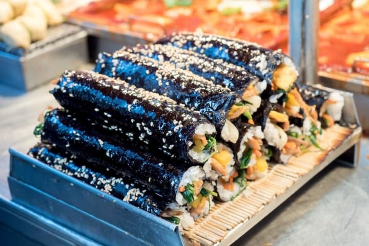 There are a lot of different varieties of kimbap, but at the end of the day this dish is most comparable to sushi. While kimbap doesn't always contain raw fish like sushi does, it is still wrapped in rice and seaweed, The rolls tend to be larger, as well, and are a healthy snack option that can be eaten on the go.