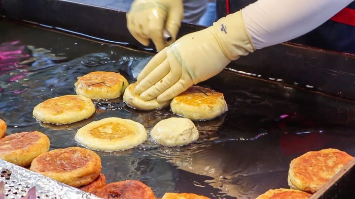 Hotteok is the name given for a sweet, fried pancake. The dough is a typical flour dough that is usually filled with some form of sweet filling and then fried on a flat-top griddle. Some Korean cities, such as Busan, have their own versions of hotteok, but they are a consistently delicious treat!