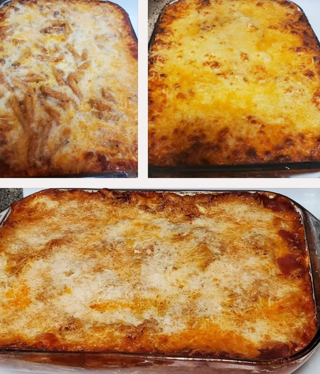 After the first half of our cheese, we spread the rest of the ziti noodles over the cheese, and then repeat the second layer of cheese. It’s now time to bake this ziti. Headfirst, into the oven. Set the timer for 45 minutes and then set the table. Cue Scenes From An Italian Restaurant, by Billy Joel.
