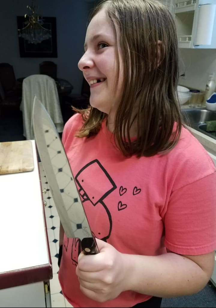 Mushrooms come next. We’ll add a package of Baby Bellas, chopped up into medium-sized pieces. Once again, The Kid handles all the slicing and dicing. I get a bit nervous sometimes at how skilled she is with our “murder knife”. Her nickname for it, not mine.