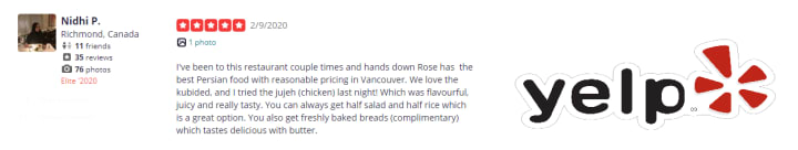 Since the 2017 Rose restaurant in King City offers delicious authentic halal Persian cuisine in a beautiful and spacious setting. The team is proud of utilizing fresh ingredients to produce high-quality foods. Ghormeh sabzi, mirza ghasemi, fesenjoon stew, and many more are just some of the highly recommended items you must try.