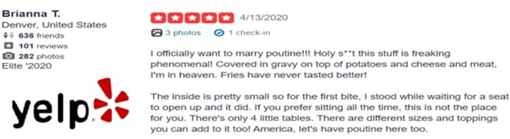 You will profoundly recommend it to others. If you are visiting Vancouver and want to experience poutine, this is the place to get it. They give you enough peppery gravy to cover all your fries, there's always enough curds, but not too many, and they're always crispy. The service is friendly, and the price is really on point! You can even get toppings like pulled pork and bacon bits. There's also vegan cheese and other veggie options!!
