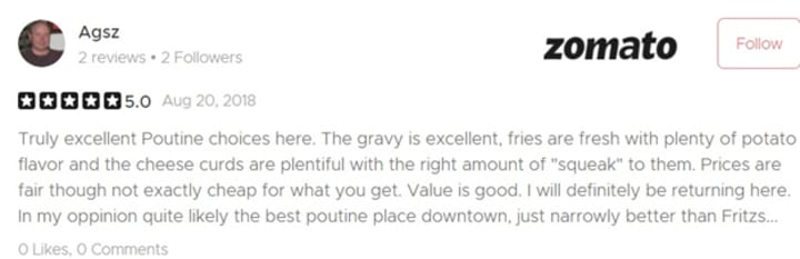 Fantastic poutine, lots of good firm curds on crispy fries with a delicious gravy. The staff is quite helpful and friendly—the biggest selection of poutine you have ever seen. You will come back with your friends. Your self here, you would try the spruce beer (nonalcoholic); it's nice to try. They use real cheese curds, thick-cut fries, and lots of gravy. So not only are you getting the authentic dish, but they also aren't stingy on their portioning, and the cheese curds are nice and big, and you get your money's worth.