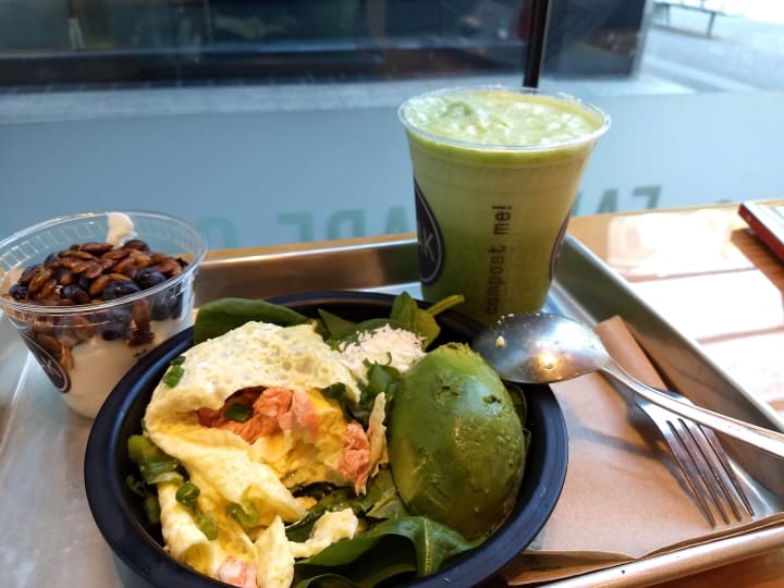 Smak has advertised at Healthy Fast Food, and that is precisely what it is. You must have a veggie bowl for breakfast - the egg was correctly done, the portobello mushroom excellent - also potatoes and yams, spinach and onion relish - you will love it! For lunch, you can have a curry bowl and thought it is perfect. This deserves four five-star dinings. It is quick, fresh, and tasty. Excellent service and sitting on the deck, people-watching is fun!