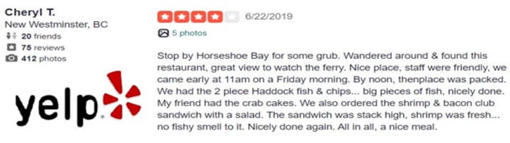 Well, here is a lovely restaurant in a stunning location, a short walk from the Horseshoe Bay ferry terminal. The service is warm and friendly, the menu has a pretty good selection of eats, and the prices are not much—lots of tables and seats. And the food comes out after a short wait.