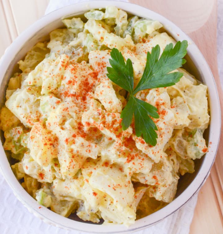 No matter how cooks prepare their potato salad, it is never complete until they sprinkle paprika on top of the dish. Even though many ingredients are inside the bowl, it is what's on top of it that gets the attention of potato salad topped with paprika.