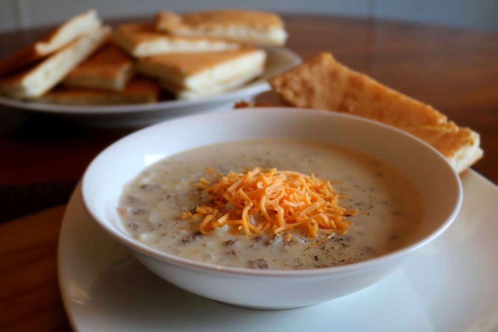 You can top it with cheese, bacon, diced green onions, or eat it plain. This is good with saltine crackers, biscuits, or homemade flatbread. My son and daughter-in-law like theirs with cornbread.