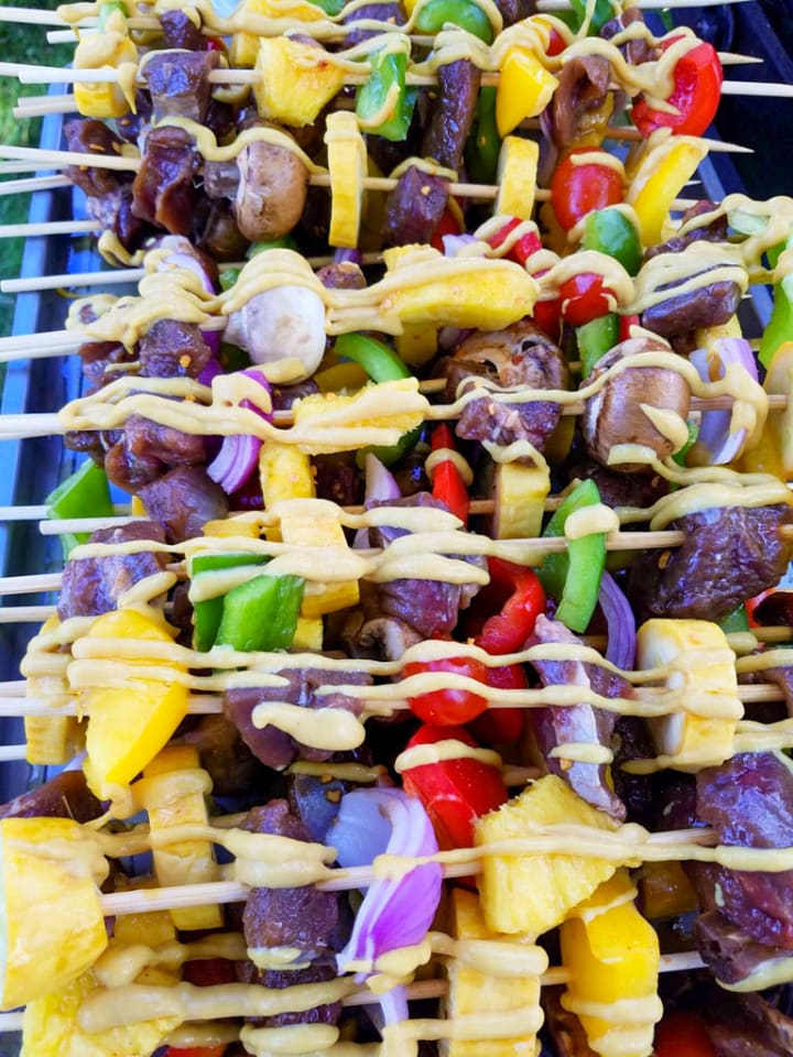 Venison brined in sea salt brine, marinaded in soy sauce and olive oil, sprinkled with seasoning, drizzled with honey mustard, and perfectly grilled with your favorite fruits and veggies.