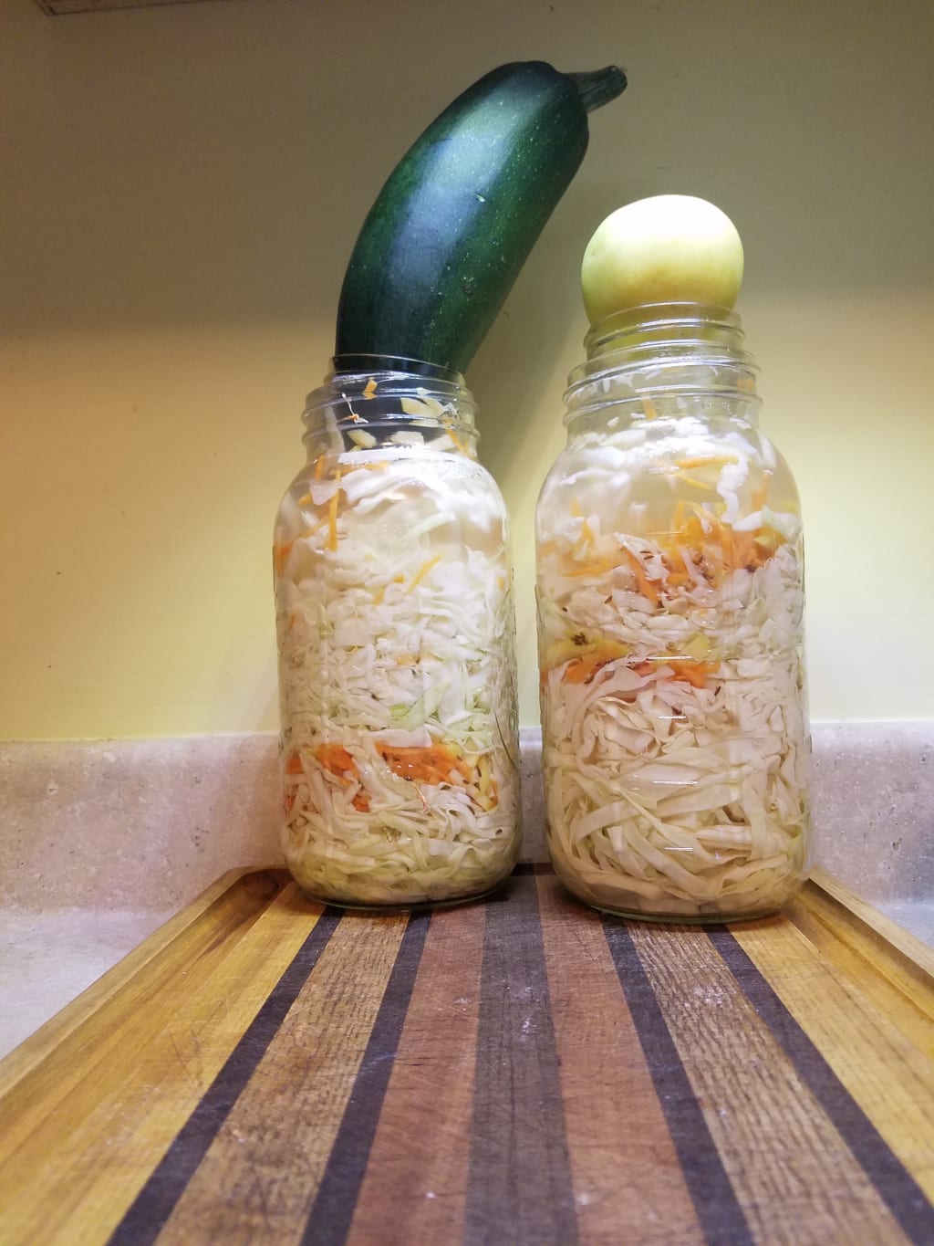 From there, the cabbage gets packed into the jars. I use an old mallet, its end smoothed to wooden silk by years of use, to pack the cabbage as tightly as possible. It'll wilt further as it sits, leeching more brine as it begins to bubble and sour. I try to save this task for when I'm angry, or feeling helpless. It's therapeutic, a rhythm of its own, a way to smash things constructively.
