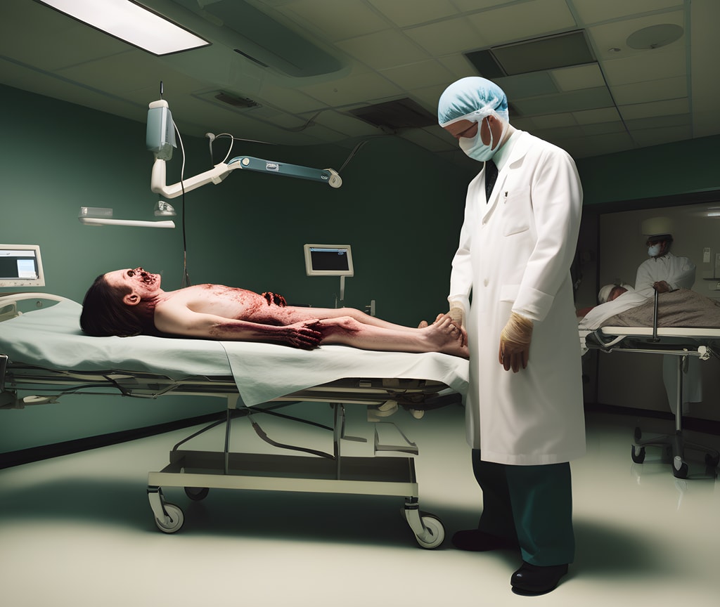 Present Illness: A 54-year-old mortuary assistant, grave-digger by trade, was brought to the Emergency Department by EMS. In otherwise apparent good health, he presented as an agitated man distraught over a corpse tightly adhering to his entire ventral surface--contiguous with his ventral pelvis, abdomen, and chest.