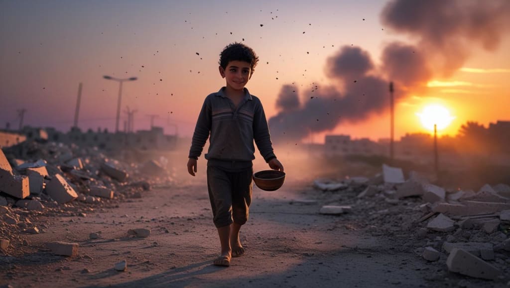 Amir was only a child—thin, barefoot, and dust-covered from the long walk he had taken. In the rubble-strewn streets of Gaza, where dreams have been replaced by drone sounds and sirens, Amir walked 12 kilometers in search of something many take for granted: a piece of food.