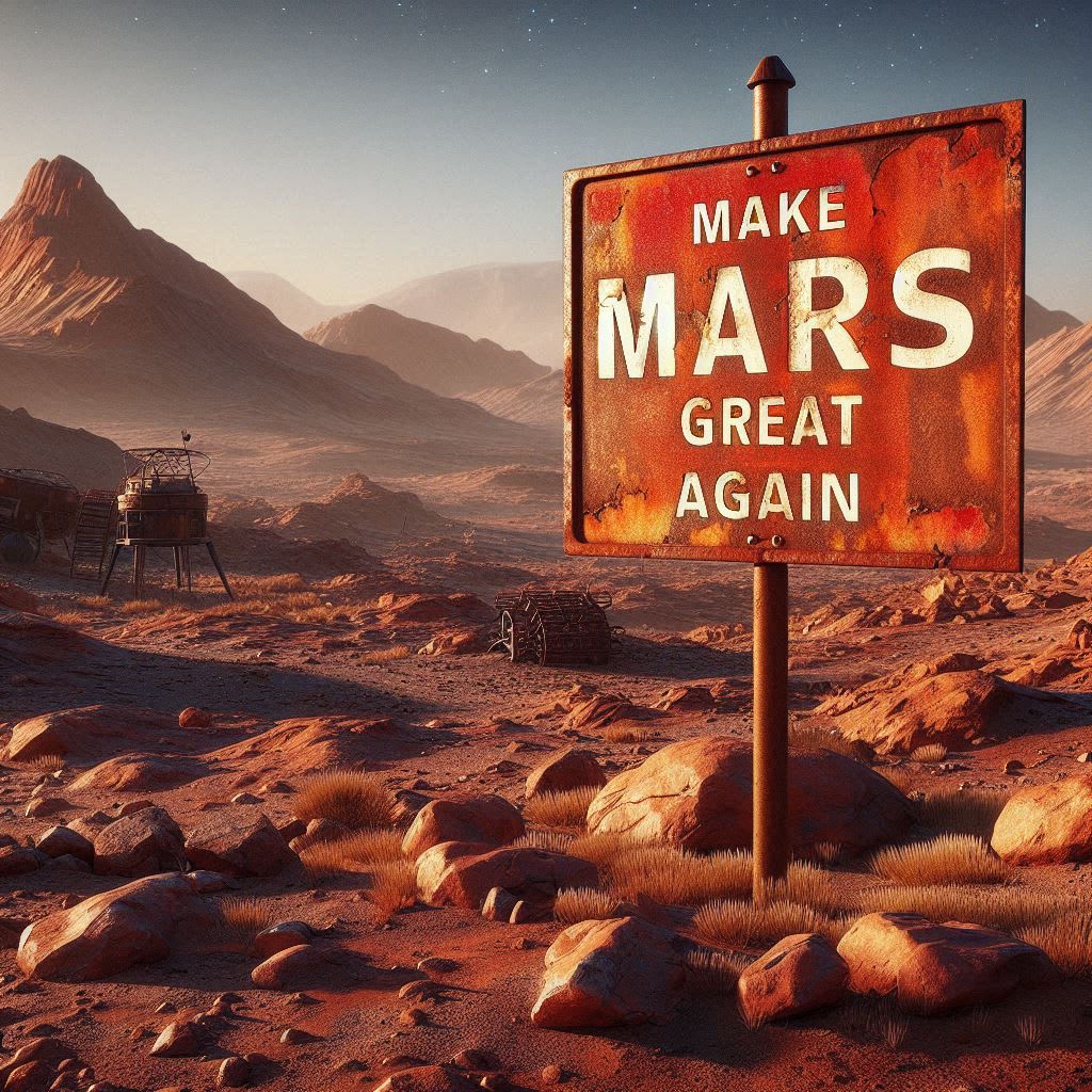 It is said that three billion years ago Mars--lush and fertile--was at peace in the solar system. And a great Martian, Dictator-for-a-Sol Quidnak, rose to lead but refused to leave. Cosmic disorder ensued; the radiation belt and atmosphere were lost; water evaporated; and everything had worked out great. He had made Mars Great Again.