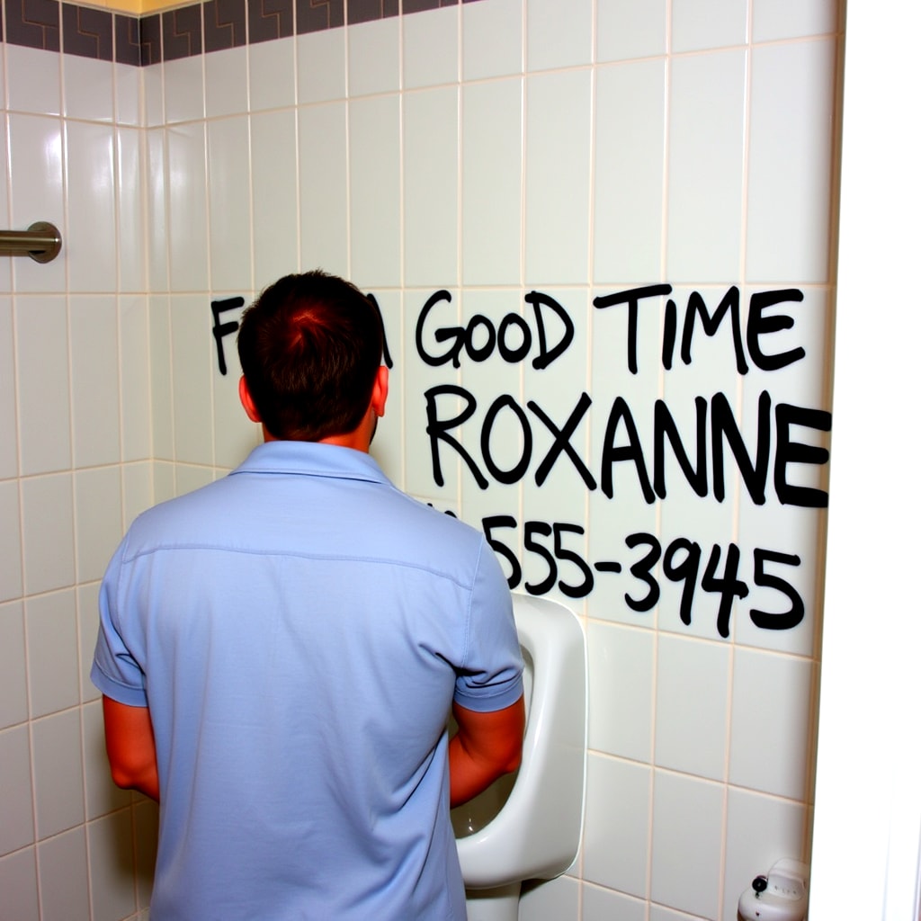 After three pitchers I was in the restroom to recycle my beer. Looking up, I read , "For a good time, call Roxanne."