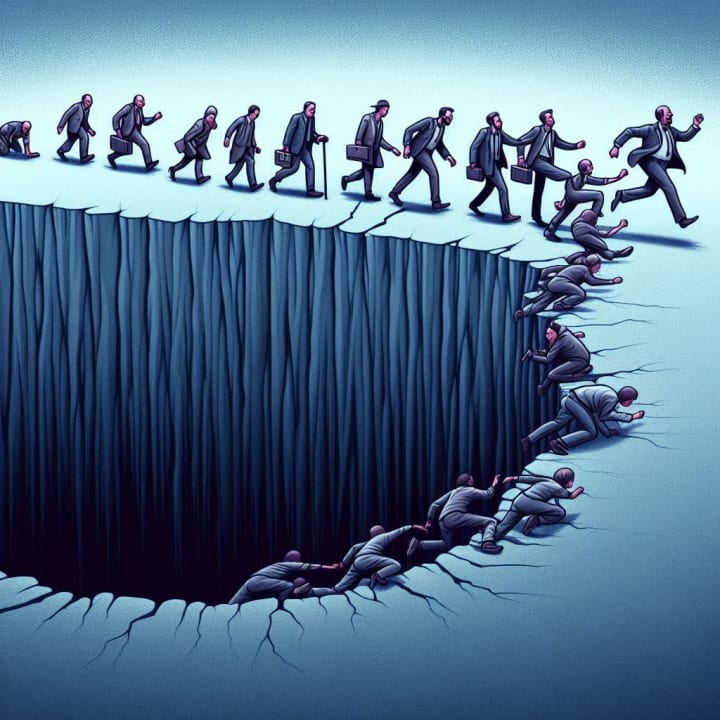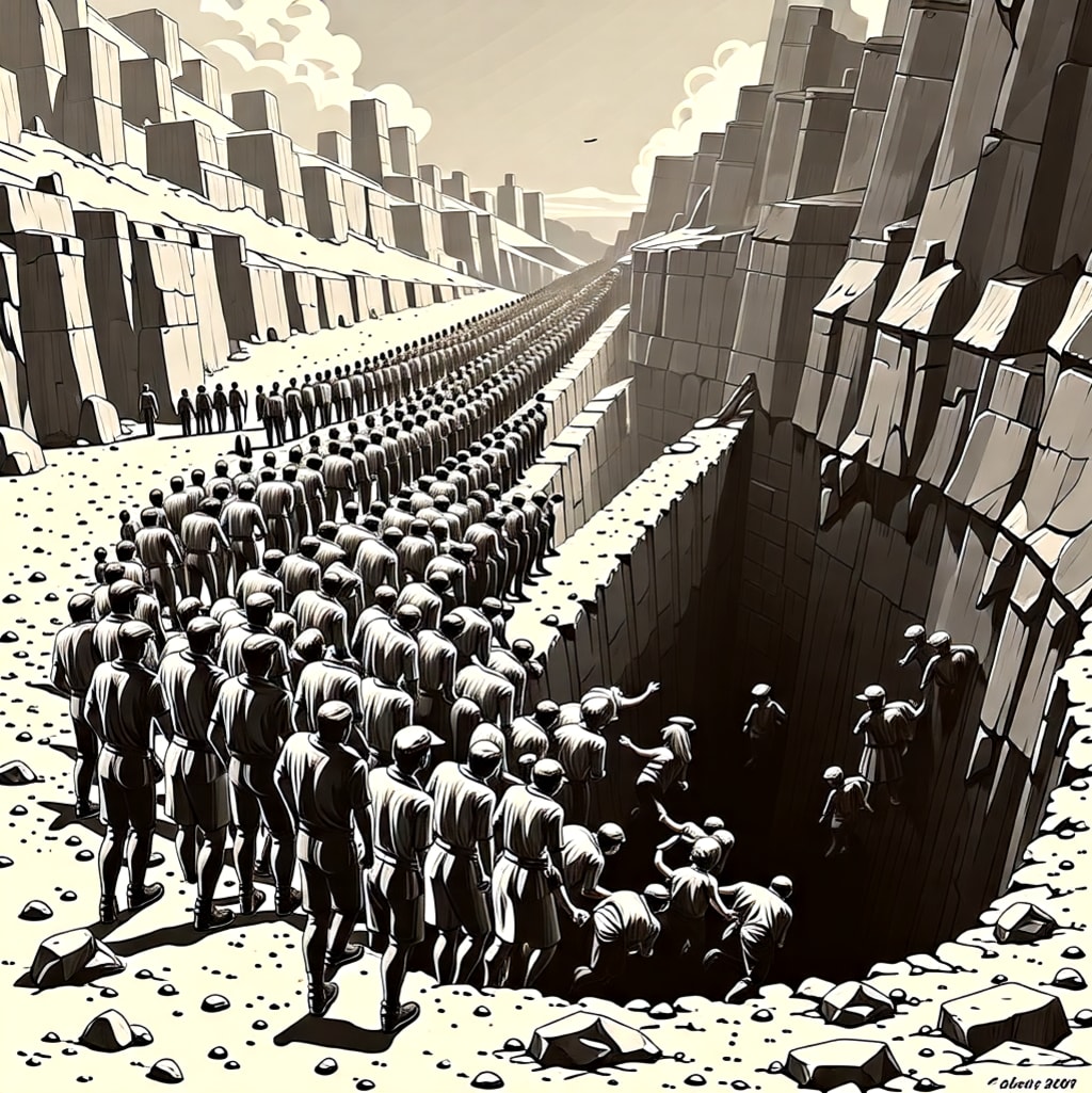 Ultimately, I saw the reason for their immobility. I saw the end of their road—a large hole, with desperate souls resisting the fall. The clawing of hands and digging of feet, easily explaining the lack of progress behind, were no match for inevitability, as they fell in clumps to their doom.
