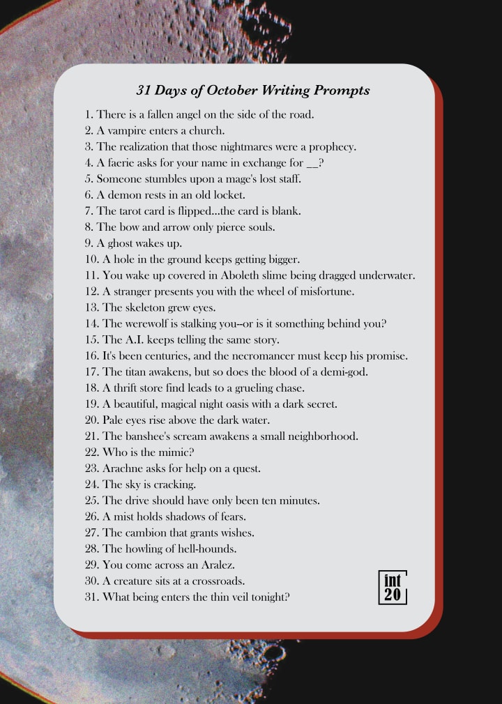 Below are the 31 writing prompts for the spooky season. I hope it gives you ideas to have fun with—or to inspire a much larger story.