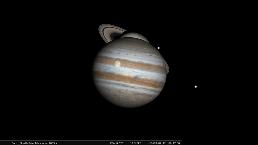 Around 7 B.C., the Earth was on the opposite side of the sun as Jupiter and Saturn, so since they took longer to revolve around the sun, in the sky—in Pisces—no less, they would seem to advance together and then actually stop.