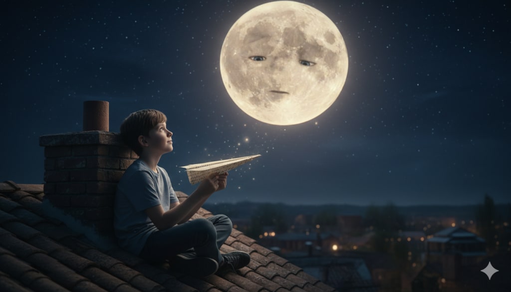 The Moon, silent as ever, shone a little brighter. A beam of light seemed to trace a path from his heart, down to the garden, to his school, to the streets where his paper wishes had landed and taken root.