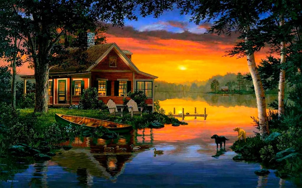 She was taken in awe of the beauty of the sunset that had painted the sky in brilliant hews of orange and blue, and was taken by surprise by the two dogs that scampered their away across the creek to greet her, one with a good sized stick in his mouth that he dropped at her feet.