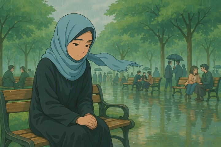 But that sad girl sitting alone on a bench is turning this moment melancholic. That girl is making this weather seem gloomy. The light breeze is rustling the leaves on the trees. The wind is blowing her scarf.