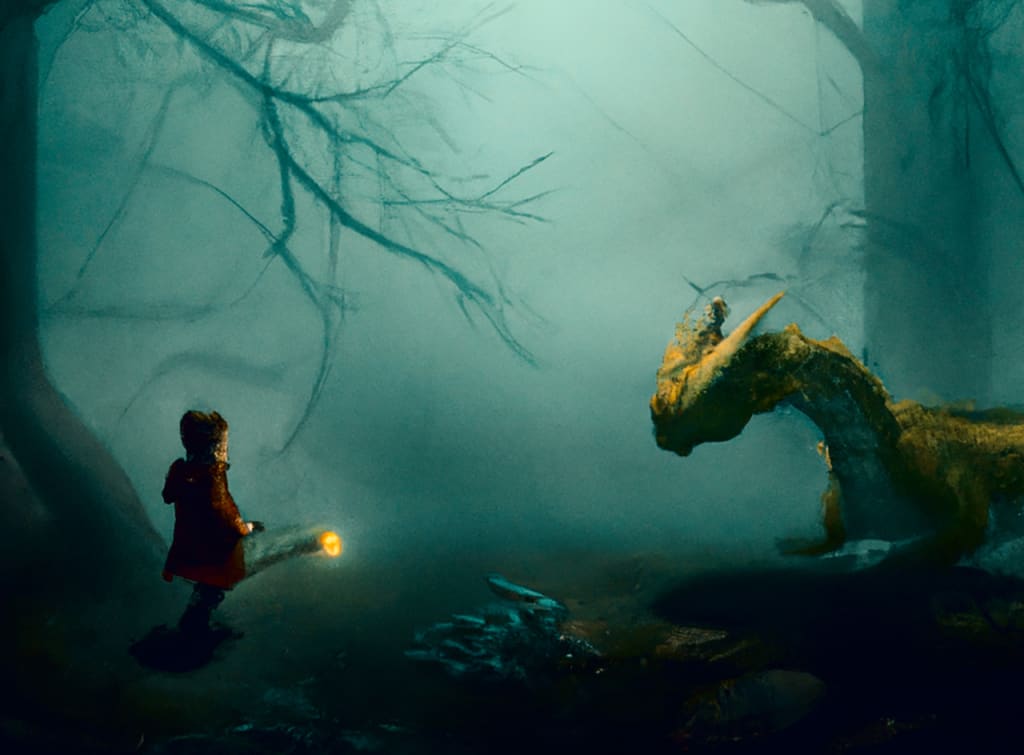 “Ahh,” the dragon breathed a long sigh of understanding. Wisps of smoke rose from its nostrils. “I see. It is not wise for a boy such as yourself to be so deep within these woods. Are you not a little young to be venturing so far from home?”