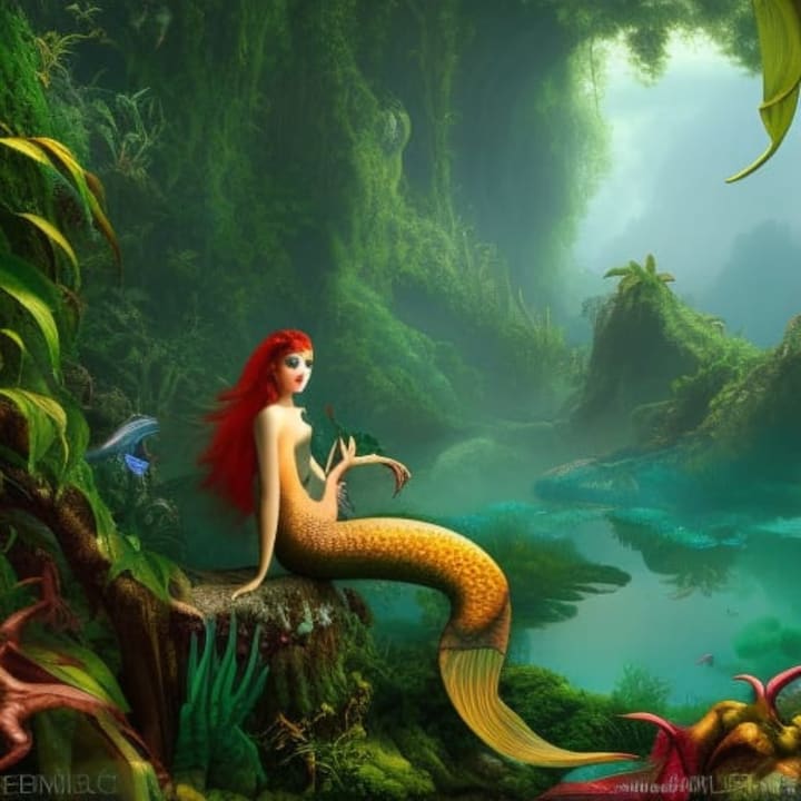 Wandering through this forest of words you come to a river of letters where you meet a mermaid who asks you if you live in this jungle. You touch the scales of her tail and say this is the Forest of Words, but not a jungle at all.